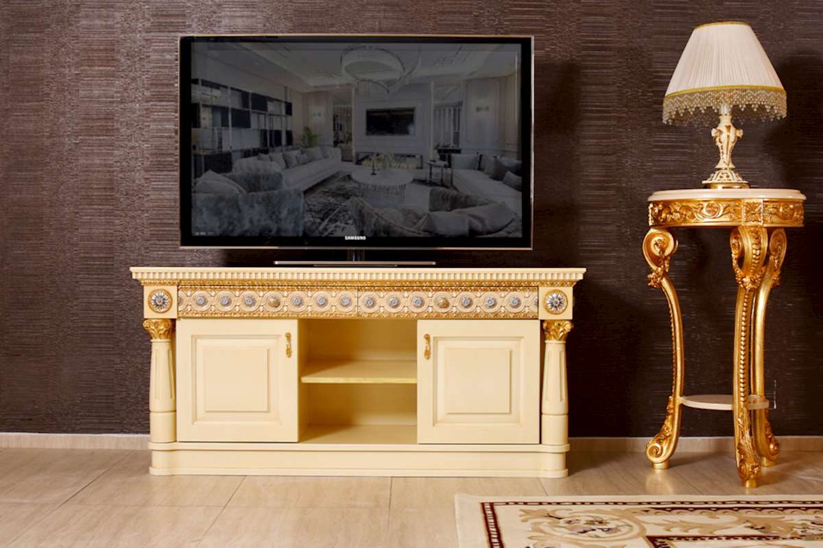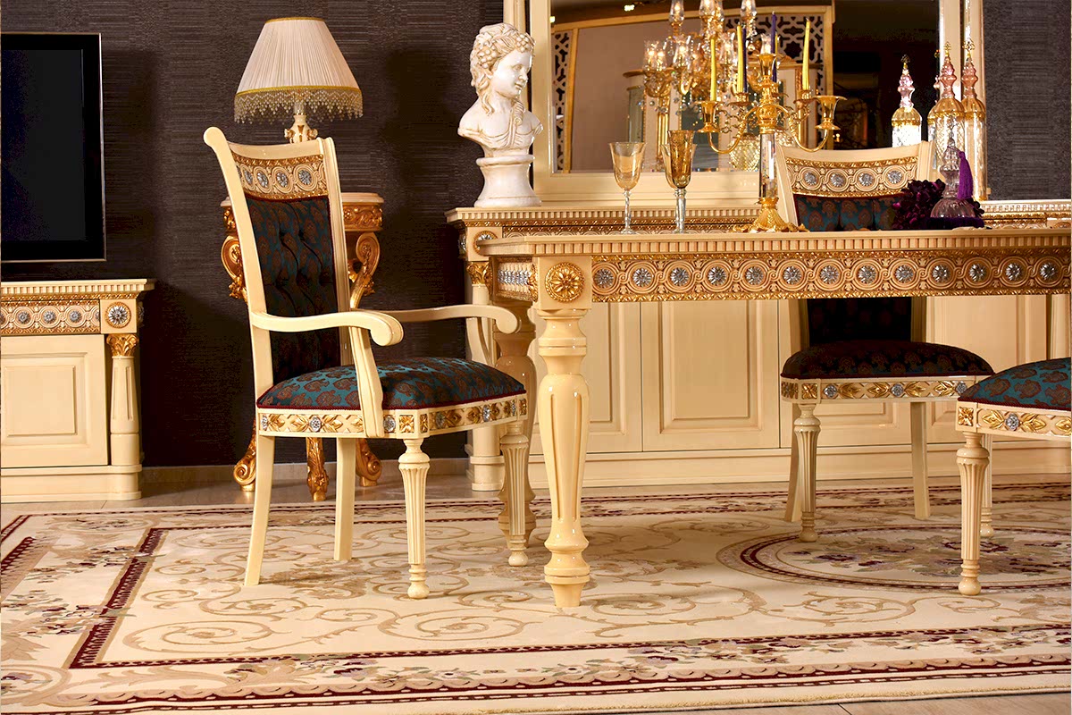 Bianca klasik yemek odası takımı ihtişamı ve zarif oyma motifleri ile salonlarınıza düşlediğiniz saray havasını kazandıracak. El işçiliği ile üretilen yemek odası modeli, masa, vitrin, konsol, ayna ve sekiz adet sandalyeden oluşuyor. Konforlu bir kullanıma sahip olan sandalyelerin iki tanesi kollu, altı tanesi ise kolsuz olarak tasarlandı. Lüks yemek odası modeli aynı zamanda kendi grubundan olan Bianca tv ünitesi ile de kombin edilebiliyor. Antik krem zemin zerine altın varak işlemler ile renklendirilen yemek odası modeli, kullanıcının istediği farklı renklerde üretilebiliyor.