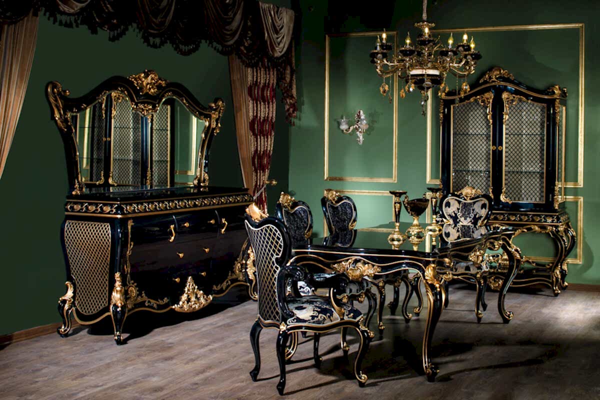 Lüks yemek odası takımı 6 sandalye, klasik yemek masası, lüks konsol ve ahşap vitrinden oluşurken, takıma klasik avize modelleri ve konsol üzeri aksesuar modelleri eklenebiliyor. Yemek odası grubu tamamen el işçiliği ile imal edilmekte olup, kullanıcıların yaşam alanlarına uyum sağlaması açısından özel ölçü ve renk seçenekleri ile de üretilebiliyor. Göz alıcı tasarımı sayesinde ilgilerin odağı olacak olan yemek odası takımında parlak ahşap cilası tercih edildi. Altın varakların oyma motiflerinde tercih edilerek, takımın ana rengi olan siyah rengi ile mükemmel bir uyum yakaladığını görmemek imkansız.